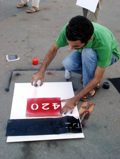 Asim making posters for an anti-Emergency rally, Dec 2007. Photo: K.B. Abro