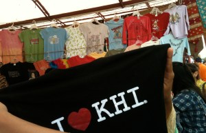 Holding up a 'I ❤ KHI' t-shirt at Itwar Bazar, July 2011. Photo: Beena Sarwar