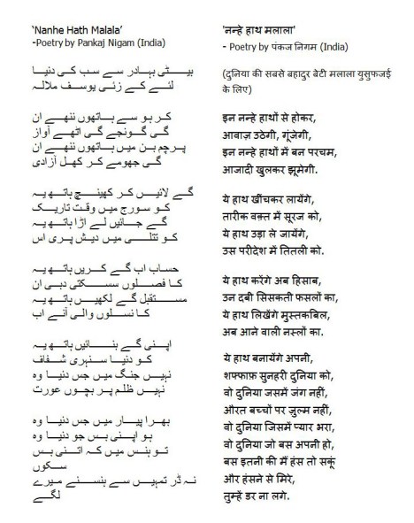 | Friends, this is for dear brave-heart Malala Yousafzai. Request you all to support her and spread the message she stands for. Sharing my poetry ‘NANHE HAATH MALALA’. Thanks to my poet friend Nafey Kumail for giving me the idea of URDU translation and thanks to Nasir Mustafa Rana, my friend from Pakistan, who did the translation…I am touched. Thanks to all. My humble tribute to her. God bless Malala. |