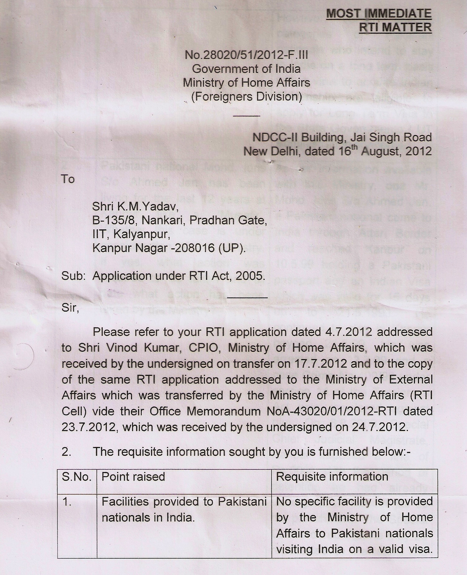 Home Ministry’s reply to K.M.Yadav’s RTI application… The first of ten pages
