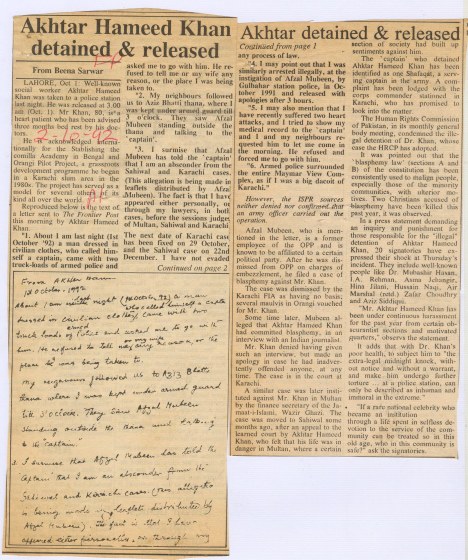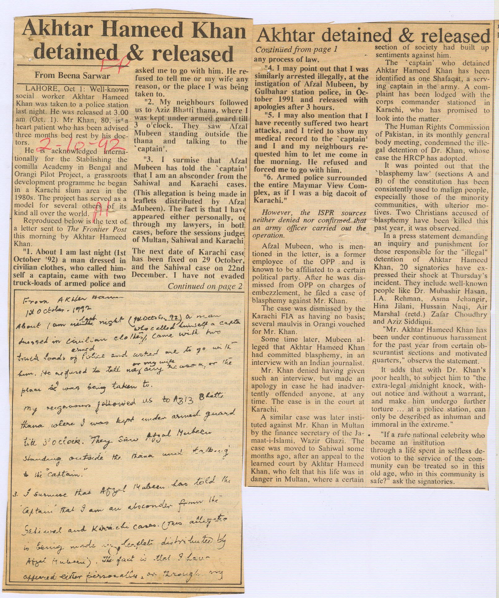 Police detain Dr Khan: My report in The Frontier Post, Oct 1992.
