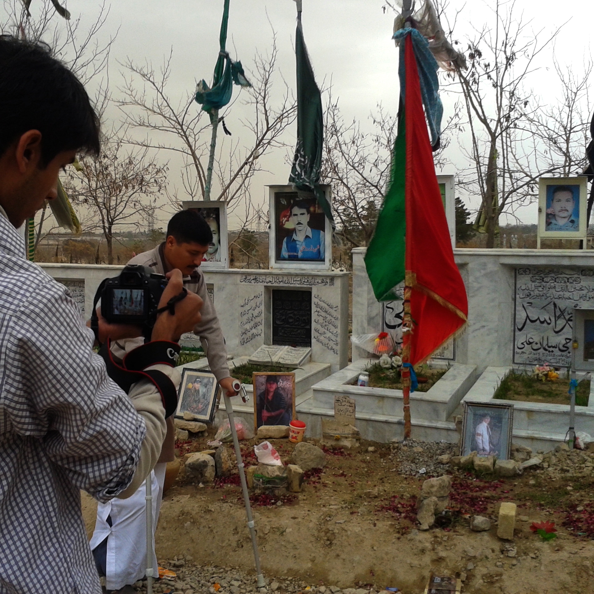 At the Hazara graveyard in Quetta: Agha Mujtaba practices walking, Anas filming him