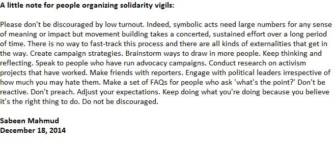 Sabeen's advice to people organising solidarity vigils, Dec 18, 2014 (in the wake of the Peshawar APS massacre)