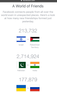 According to Facebook data, 2,604,986 Facebook users from India and Pakistan connected as ‘friends’ on 4 March 2018, from its site, www.fb.com/peace, that provided data on how many people formed friendships daily across three conflict zones. (These are the same figures as on 26 December 2017 so perhaps Facebook had stopped updating the numbers before discontinuing the tool). The average for India and Pakistan, going by numbers updated daily, was around 2,500,00 pretty much any day. This indicates at least a level of curiosity if not aspirations for peace and friendship across borders, that social media platforms provide space for.
