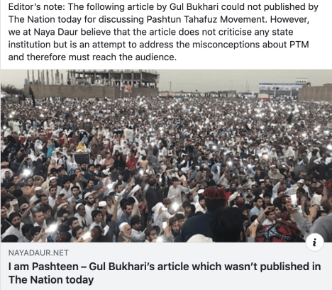 When daily The Nation dropped weekly columnist Gul Bukhari’s op-ed about PTM she sent it to Naya Daur’s editor, Raza Rumi who has been based in the USA since escaping a murderous attempt in 2014. Naya Daur, which was also sharing other PTM-related material, posted Bukhari’s piece on April 16, 2018. The website was subsequently blocked in Pakistan for a week (April 21-28, 2018). The Pakistan Telecom Authority as well as the country’s largest internet provider, the semi-private Pakistan Telecommunication Company Limited, denied responsibility. Mobile phone users subscribing to the service provider Wateen, as well as Chinese provider Zong, could also not access the Naya Daur website.