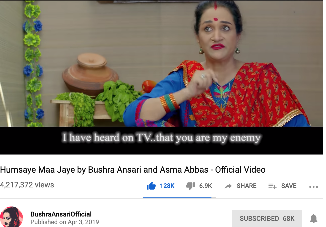 Screenshot from Bushra Ansari-Asma Abbas video, 3 May 2019. Over 4 million views on one YouTube channel alone.