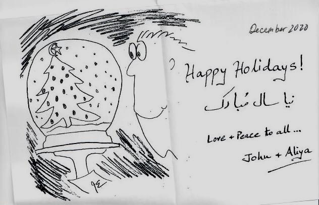 On a related note, I love the Christmas greeting cards by John Ezzo in New Jersey. I’m lucky to be on his recipient list since re-connecting with my old friend, his wife Aliya Rab, a few years ago. I first got to know Aliya through the the Asma Jahangir-led Human Rights Commission of Pakistan, when we were both on its Council. John does these simple, creative line drawings on a single sheet of paper, then folds it up into four. He always includes a crescent moon and star – a subtle nod to his Pakistan/ Muslim connection. Aliya, an architect who is also healer and tai chi master, does the calligraphy. Here’s this year’s offering – note the mask on the snowman. That’s going to be a reality for some time. Hope 2021 is somewhat better.