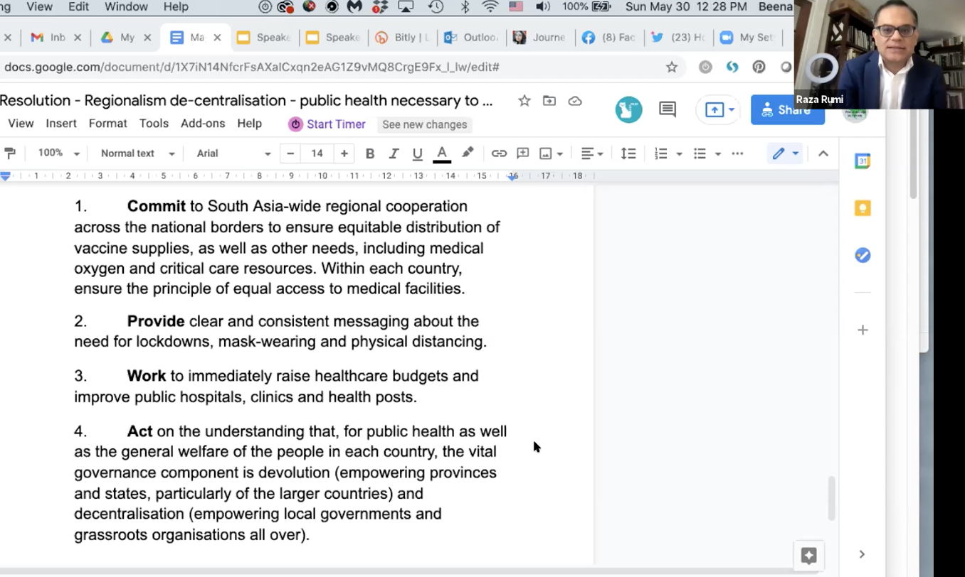 Participants endorsed the SAPAN 30 May Resolution (link here), presented by journalist and editor Raza Rumi, calling on South Asian societies to treat healthcare as a basic human right, increase healthcare budgets, collaborate to manage the pandemic and plan responses to future challenges. “Our future cannot be held hostage to a past. We have to form an alternative trajectory for our combined futures,” Rumi said.
