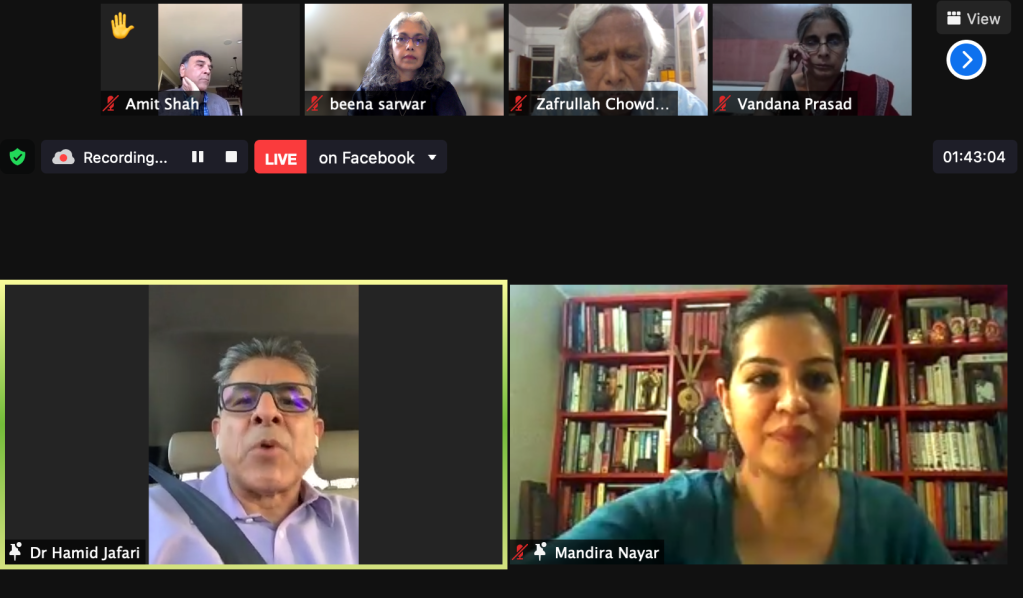 Journalist Mandira Nayar in Delhi moderated the physicians’ panel with Dr Zafrullah Chowdhury in Dhaka; infectious diseases specialist Dr Anup Subedee in Kathmandu and public health activist Dr Vandana Prasad also in Delhi. Dr Hamid Jafari of Pakistan, who led the WHO team that eradicated polio in India, joined from his current posting in Jordan.
