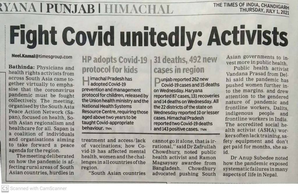 The South Asia Peace Action Network webinar Neighbours in Peace and Health, June 27, 2021, was the third in the SAPAN series: Imagine! Neighbours in Peace, a title borrowed from an unpublished Chowk.com volume, 2005