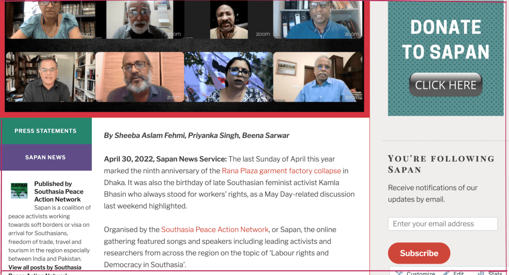 I worked with Priyanka on this Sapan syndicated feature about our event, Ahead of May Day, a call for worker unity, solidarity and a visa-free Southasia, joined by journalist Sheeba Aslam Fehmi. Wonderful to connect with Sheeba also and learn about her work with progressive activism in India – see Indian Muslims for Progress and Reforms.