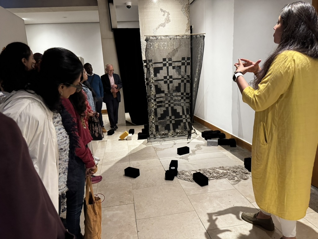 Manmeet Walia led a walkthrough of the exhibit. Showcased across three floors, it incorporates haunting elements that emerge from deep pain, introspection, and clearly, masses of research. The artists address various urgent themes and struggles across the region through various media. Their home countries are deliberately kept out of the descriptions because as Ms. Walia said, “We don’t want to box them into national identities”.