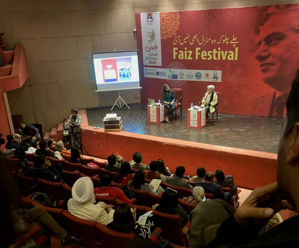 Faiz Festival 2024: Manmeet K. Walia and Salima Hashmi presenting on the then under-production Young Southasian Artists’ exhibit. Photo: Beena Sarwar
