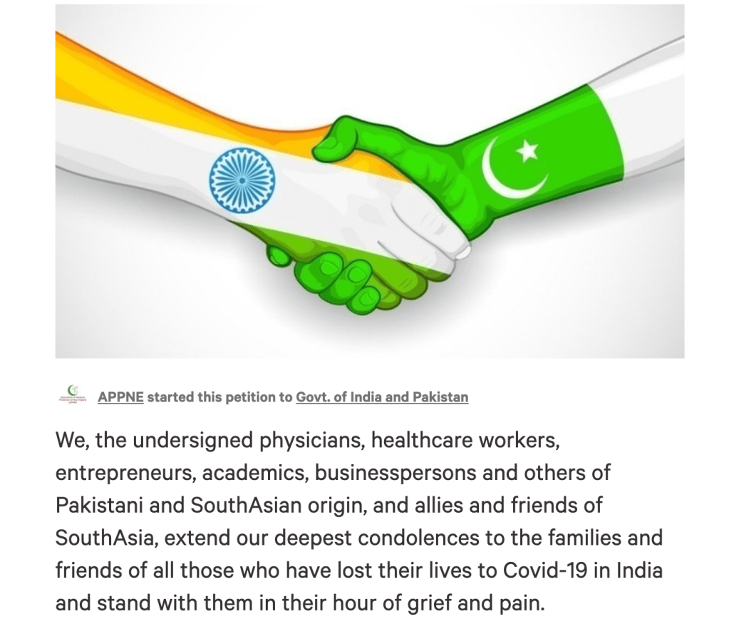 A number of us had made a similar plea underscoring the connected nature of today’s world and the regionalism of South Asia, at an online discussion originally aimed to focus on Khelne Do (play for peace) on Sunday under the series title – Imagine! Neighbours in Peace’. We changed the focus at the last minute to share grief and solidarity as the situation in India spiraled out of control.
