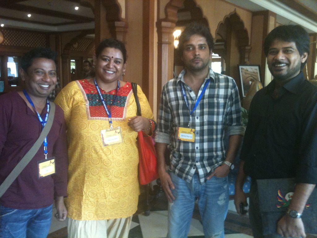Visas came through at the last minute – but the Indians still had to go and get the police reporting done. L-R: Onir, Karuna, Sanjay, being carted off to the thana by SMM volunteer Norbert Almeida. The guys there gave Karuna a freshly laid brown egg as a souvenir. Actually.