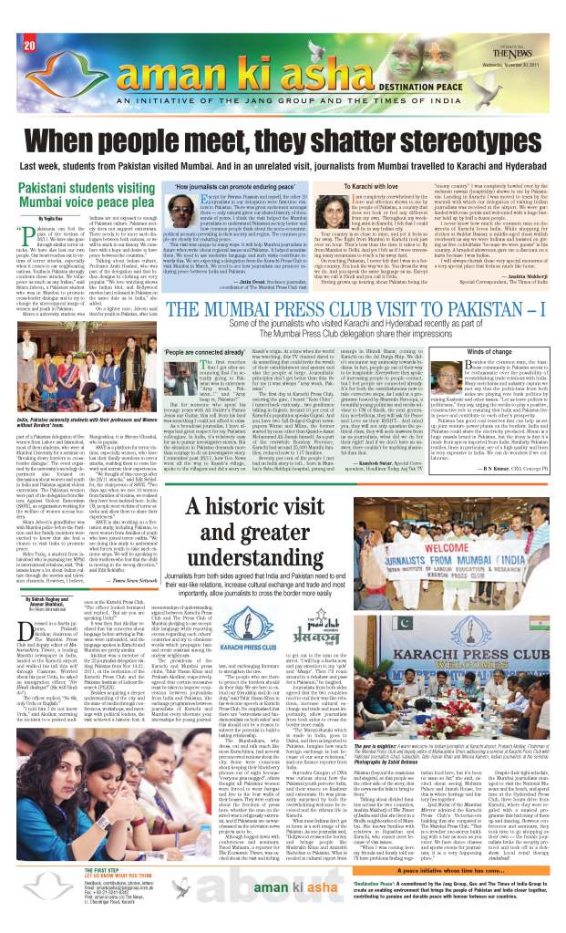 Earlier this year, students from Mumbai came up with a pioneering initiative they called ‘Ummeed-e-Milaap’ (hope for unity), a platform for Indian and Pakistani students to connect, in over 30 colleges in Mumbai, Lahore and Karachi. Last month, a 22-member delegation of journalists from The Press Club of Mumbai travelled to Pakistan to connect with colleagues in Karachi and Hyderabad, culminating in a joint Declaration of Cooperation.