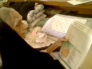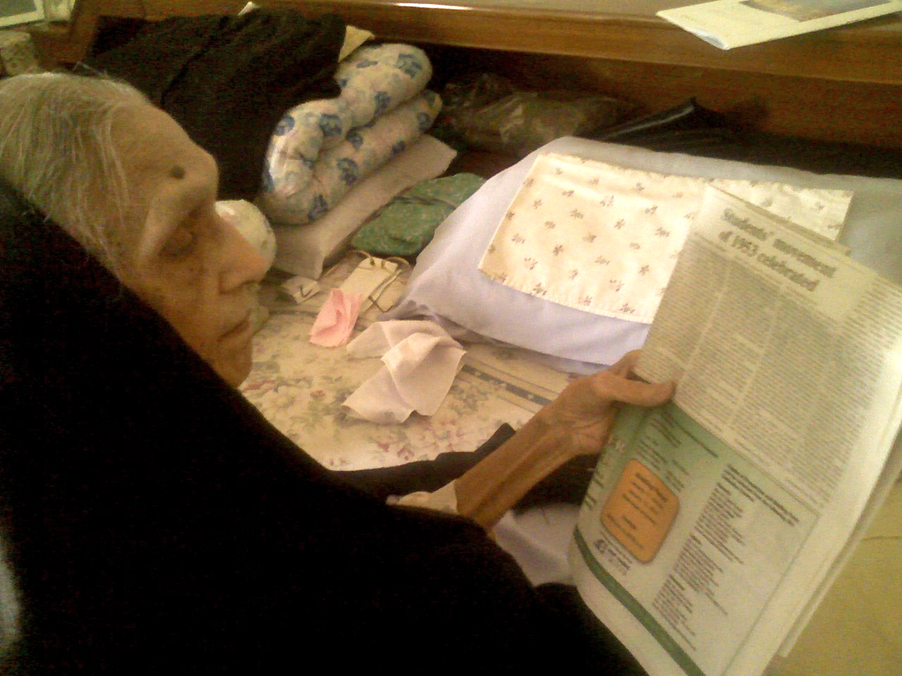 Sadiqa Waheeduddin, looking at a newspaper report about the DSF event held in Karachi Jan 2010