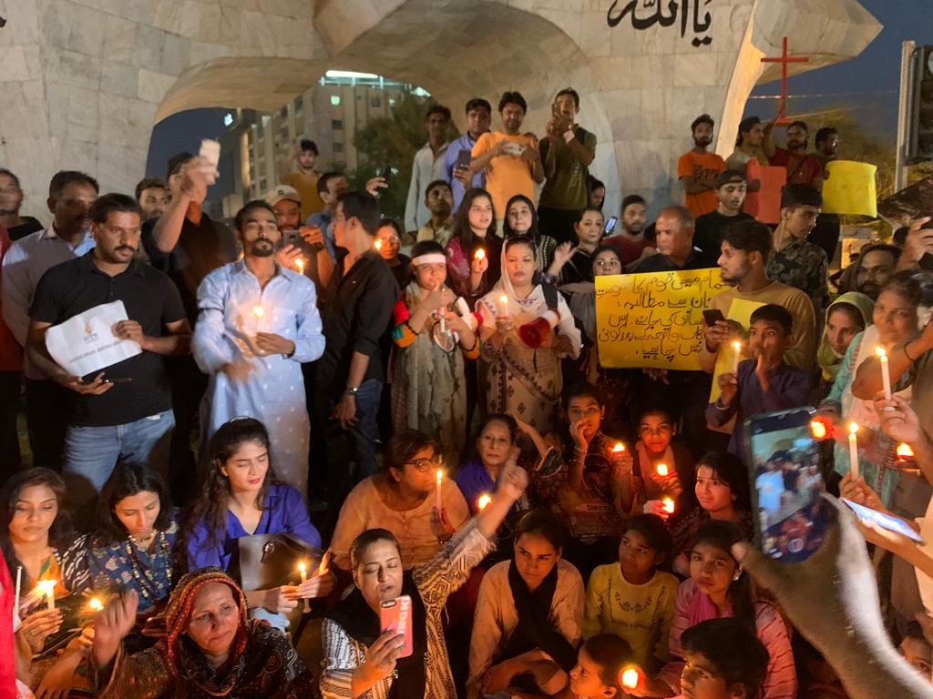 Activist and dancer Sheema Kermani led the chanting, evoking the names of a long list of Pakistani Christian individuals and communities targeted by extremist elements in the name of religion over the years.