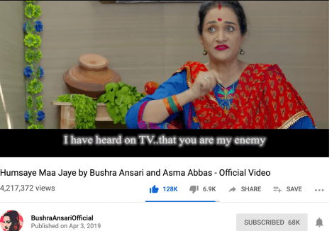Screenshot from Bushra Ansari-Asma Abbas video, 3 May 2019. Over 4 million views on one YouTube channel alone.
