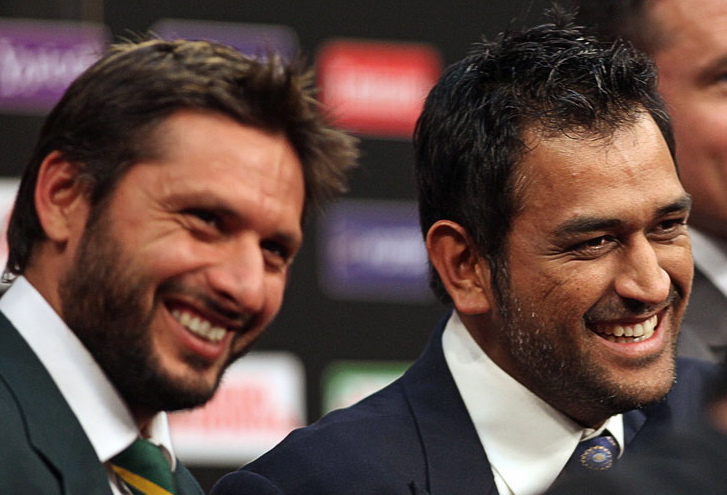 Mohali, Chandigarh: Pakistan captain Shahid Afridi and Indian captain M S Dhoni smile ahead of the opening ceremony