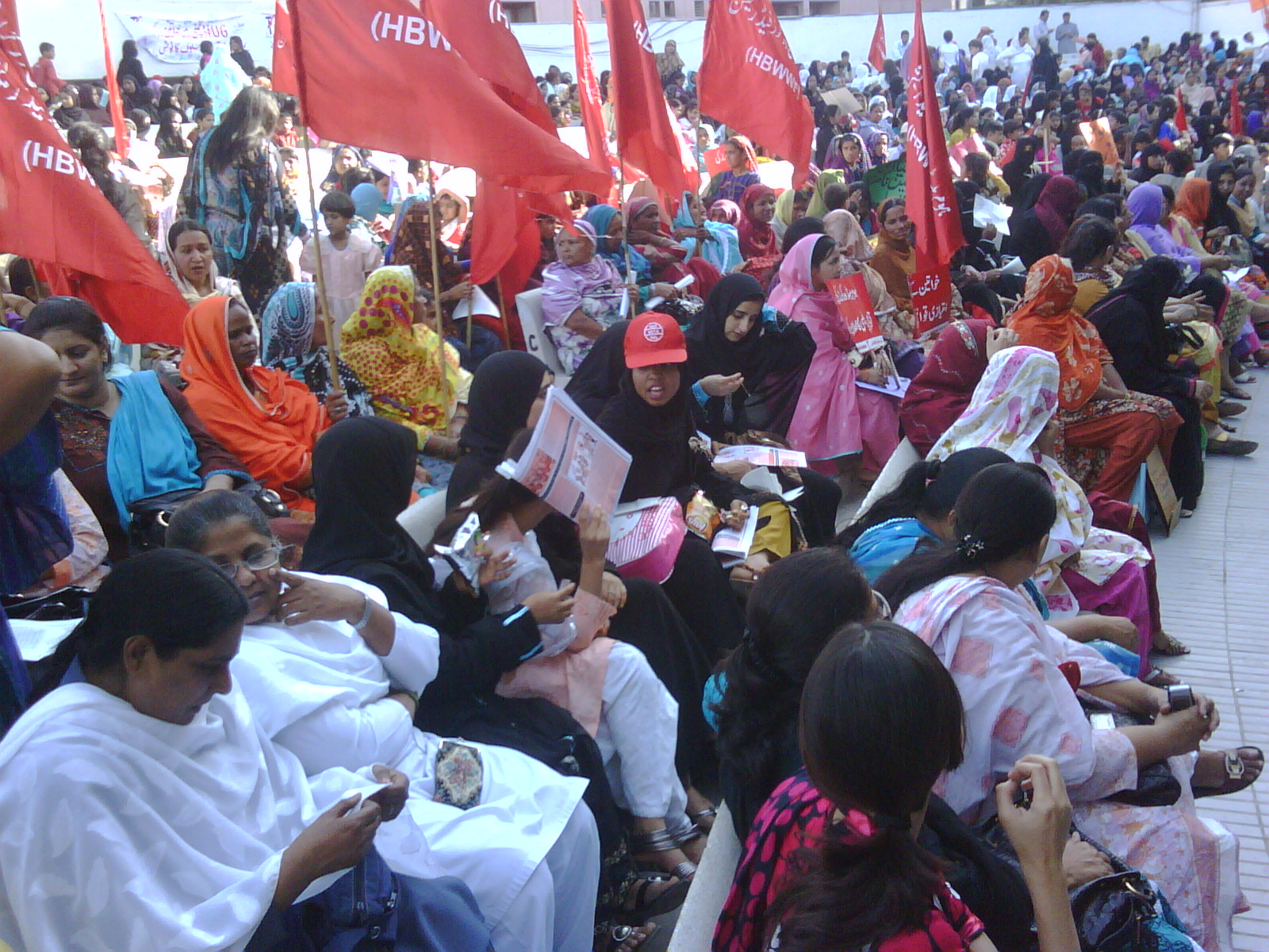 WOMEN’S DAY RALLY IN KARACHI: Thousands of working class women, many of them home based women workers, with red flags in their hands marched on roads of Karachi, chanting slogans against ‘mullahism’, religious extremism and for their democratic rights. The march started from Karachi Press Club and culminated at the Arts Council of Pakistan where a seminar was held in the open air theatre followed by songs, theatre and documentaries. They demanded: *End all discriminatory laws against women and minorities *End religious fundamentalism *Recognize home based women workers as workers in law, extend social security cover to them *Equal opportunity to women in all fields of life